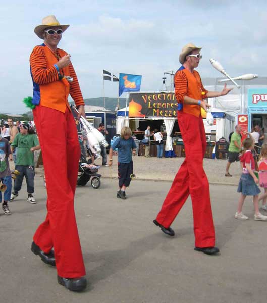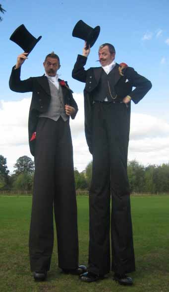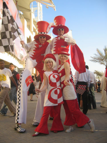 A fine fellow by the name of Jem Maynard Watts had been a ‘3rd man’ and on many occasions in place of Mark or myself and in late 2006 Jem and I formed the Double Act, The Dapper Chaps, A comedy character based act featuring Reginald ‘tic toc’ Monty Montgomery IV and Quentin ‘bang on’ Bladderhasit Caruthers III splendidly attired English Gentlemen and outrageous Old English racing drivers plus various other comedy characters! As with Phillippe-Philloppe we use stilt bicycles and Penny Farthing bicycles. The interchangeable nature and versatility of the 3 of us makes for 2 extremely dynamic, interactive and entertaining acts and an amazing stilt cycling Triple act! we have performed at F1 Bahrain from 2006 to 2016 with a different costume each time designed by myself.